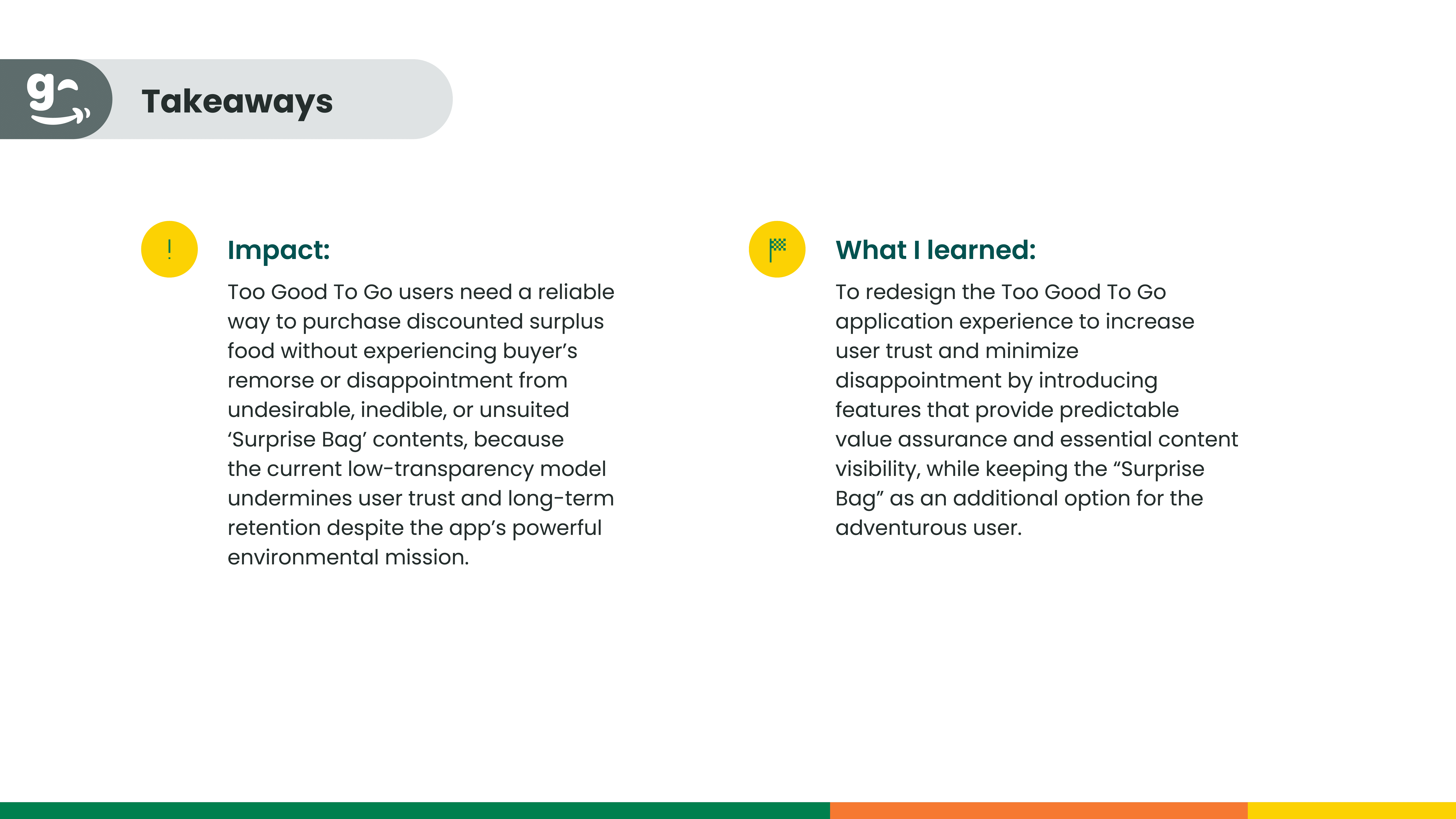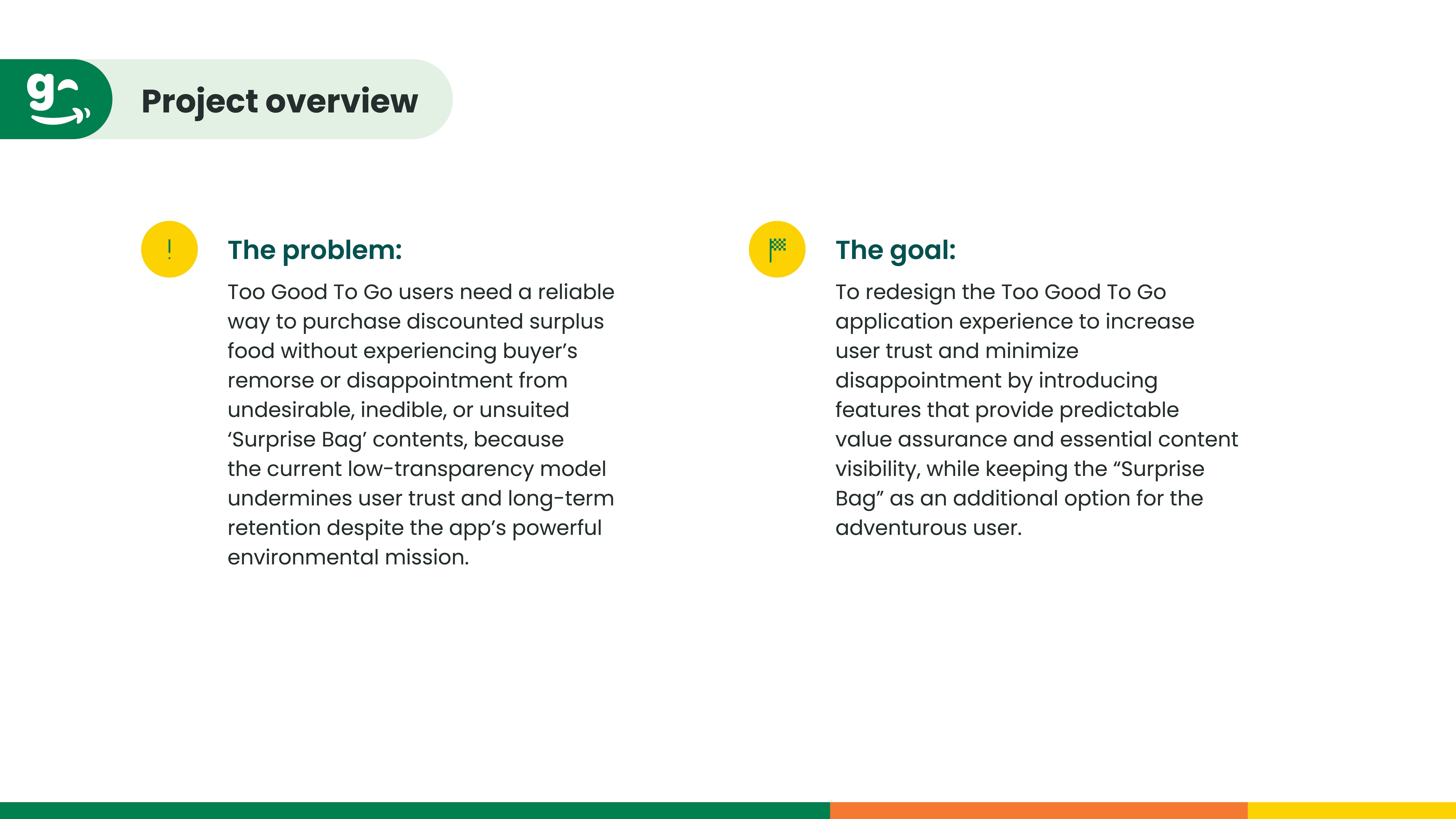 To redesign the Too Good To Go application experience to increase user trust and minimize disappointment by introducing features that provide predictable value assurance and essential content visibility, while keeping the “Surprise Bag” as an additional option for the adventurous user.