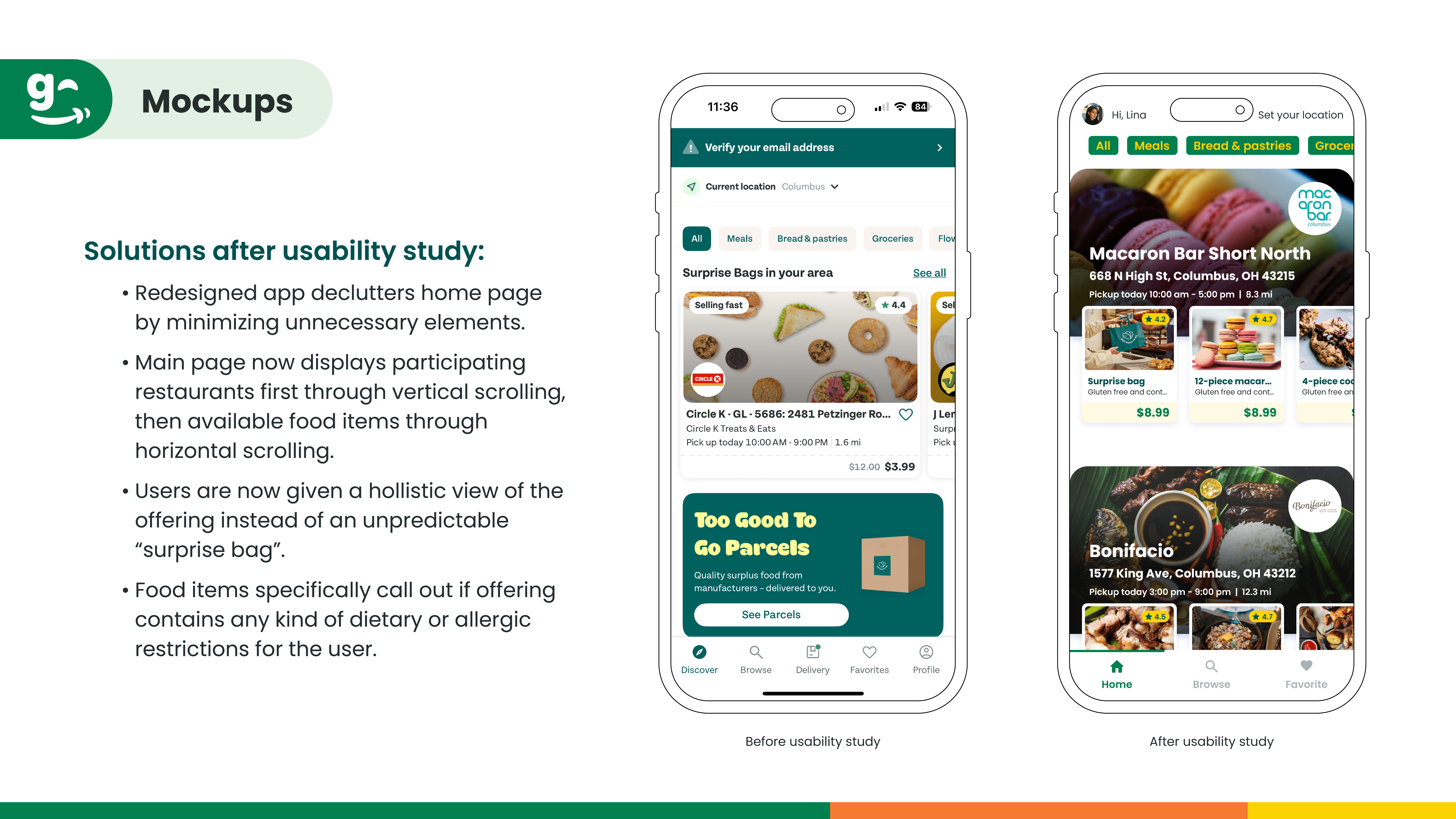 I addressed some of these issues by putting myself as the user and wanted to experience the app that promoted clarity. Some of these solutions include offering specific food items that take the guessing out of the user's hands, while also offering the "Surprise Bag" as an alternative offering. The "Selling Fast" callout was unnecessary and deceptive, so for the user to make informed decisions, I chose to remove it. It's also important to make it clear to the user if there are any dietary or allergic restrictions with the food offering, so I included that option for the awareness of the user. With the help of AI (specifically Gemini and ChatGPT), I was able to generate user personas, and the problems they might have using the app. I was able to generate a mock usability study that helped inform my design decisions, and eliminate the unnecessary elements of the app.